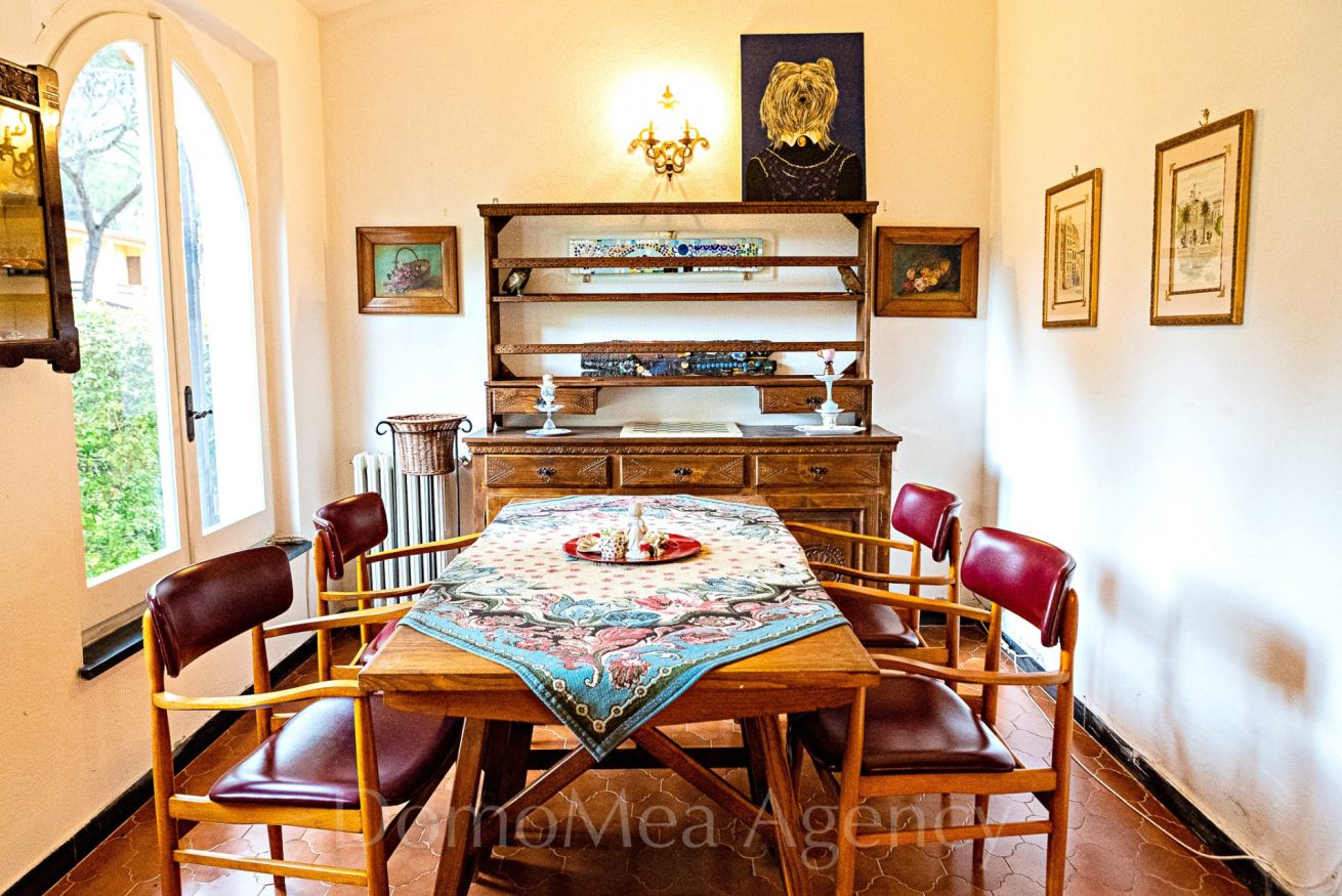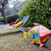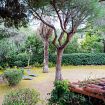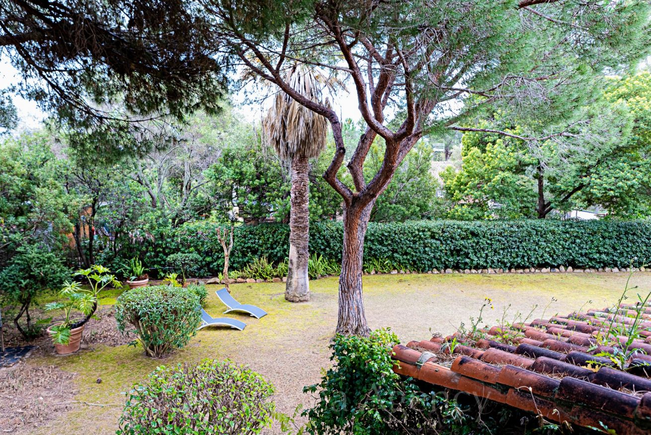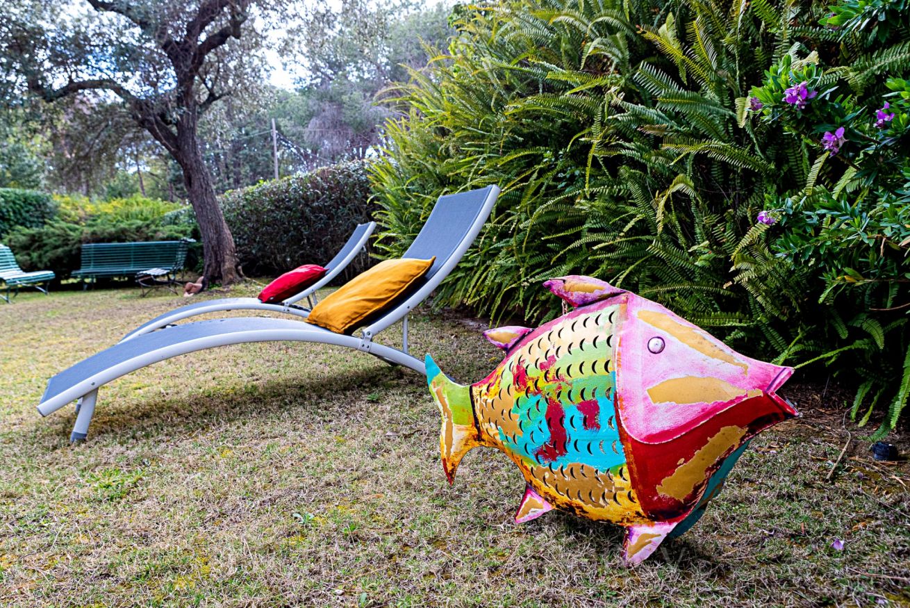 Il grande giardino, curato e ricco di essenze mediterranee, ospita alberi secolari, felci, vasi in terracotta e tocchi artistici inaspettati – come una fontana in mosaico dal gusto gaudiano o un coloratissimo pesce scultura che aggiunge un tocco di fantasia. L’atmosfera è rilassata e autentica, perfetta per chi cerca un’oasi di pace tra natura e mare.