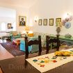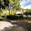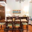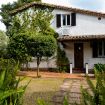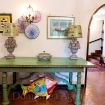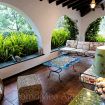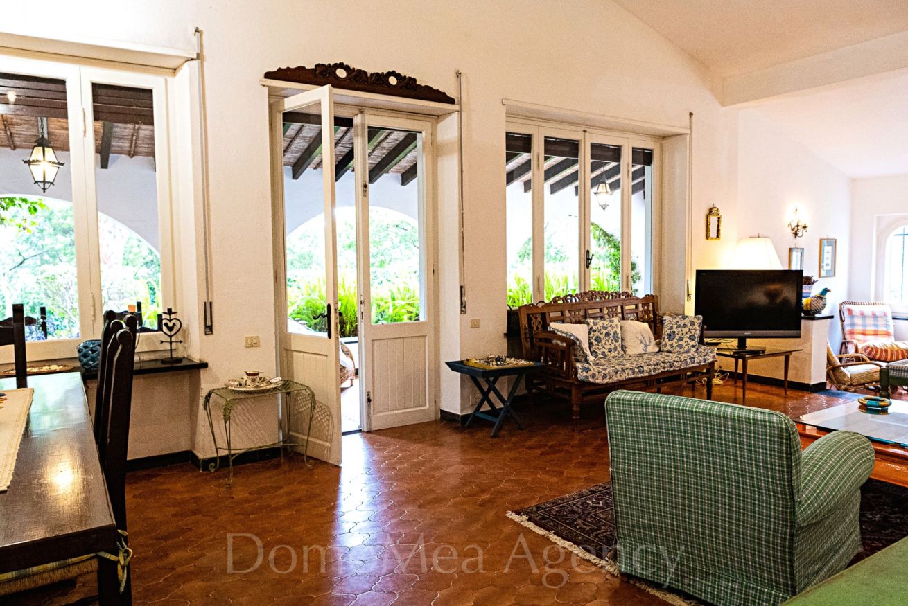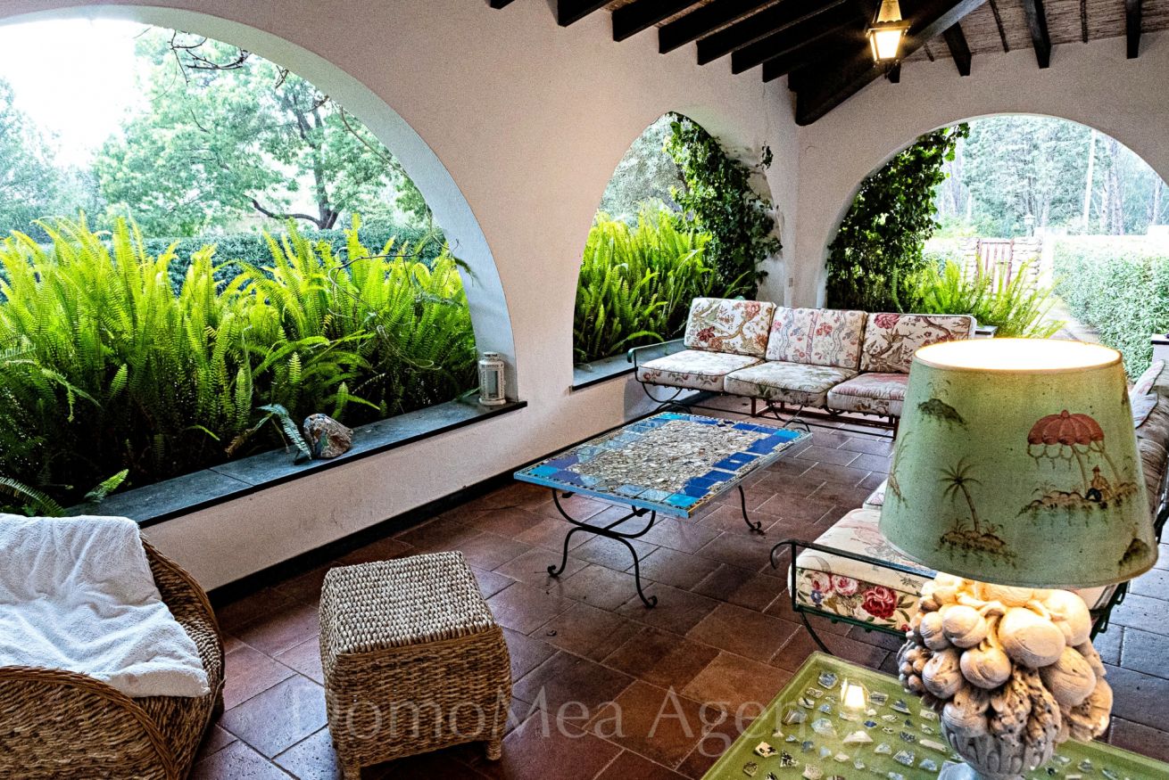 Punto di forza della villa è il magnifico portico coperto, con archi bianchi e travi in legno scuro: uno spazio ampio e fresco, arredato con divani floreali, lanterne colorate, un grande tavolo da pranzo e angoli lettura affacciati sul giardino.